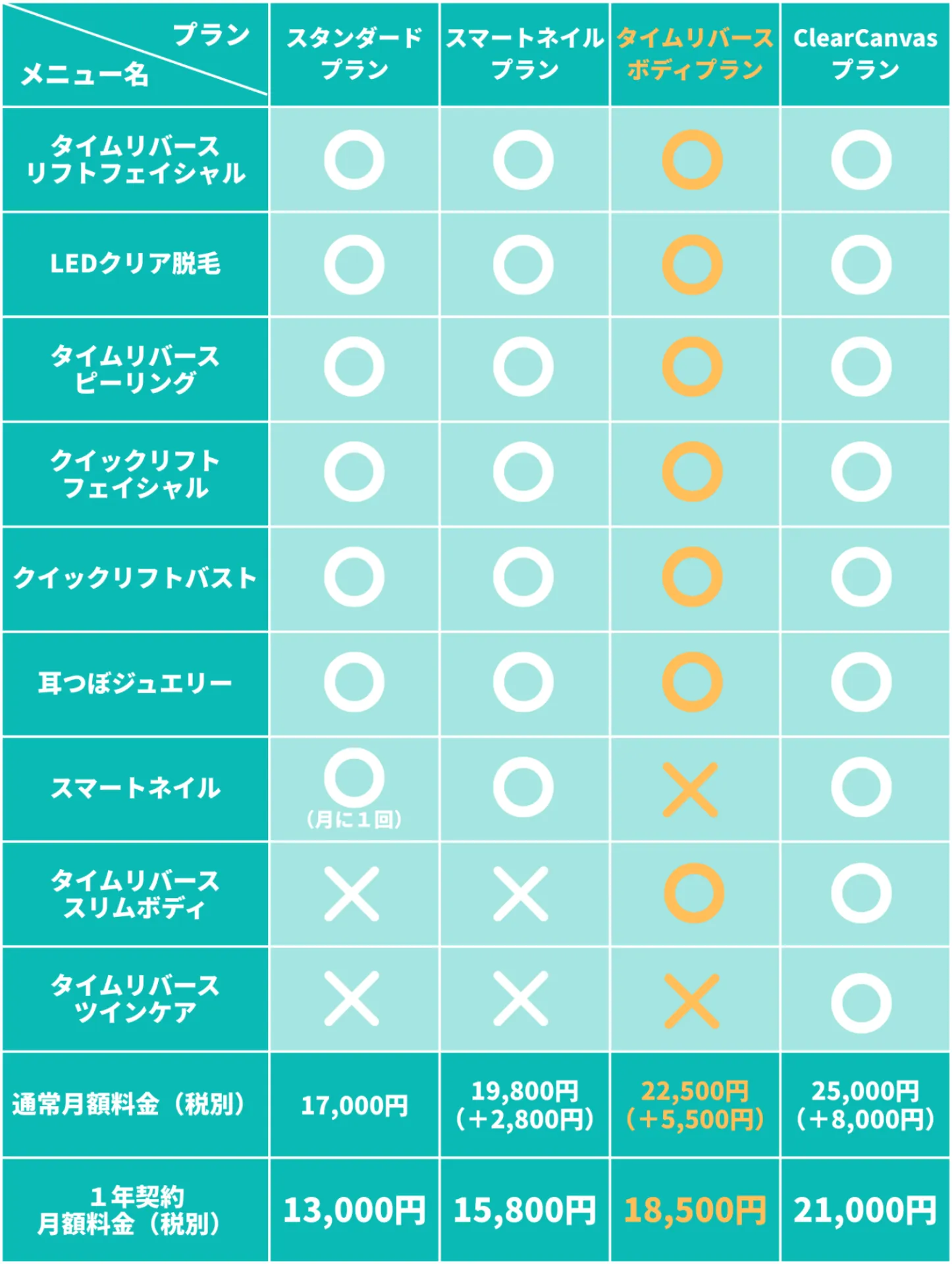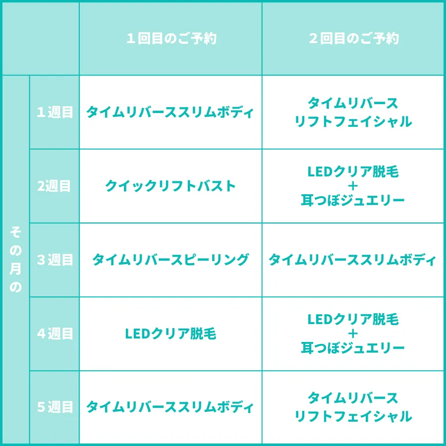 その日の目的や体調に合わせて、脱毛・クイックケア・耳つぼジュエリーなど、Clear Canvasの他メニューも組み合わせて利用できます。